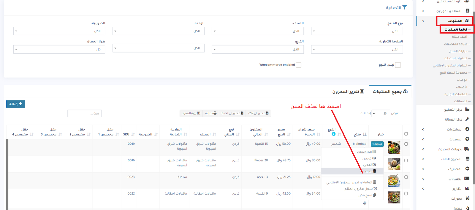ملاحظه: لن يعمل هذا الحذف إذا كان المنتج يحتوي على بعض المعاملات المتعلقة به. يمكن أن تكون المعاملة فتح مخزون أو شراء أو بيع أو نقل مخزون المنتج. سيظهر بعض الأخطاء مثل: