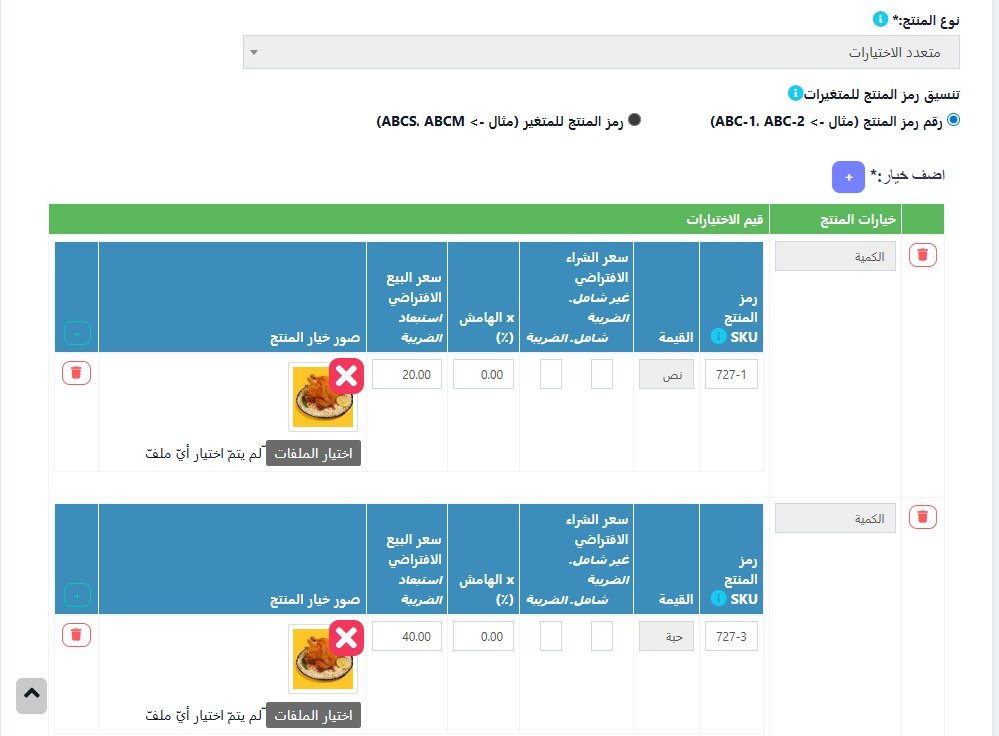 سوف تظهر قائمة منسدلة بها خيارات المنتج اختر احد الخيارات التي ادخلتها ثم اكمل ادخال باقي المعلومات مثل سعر الشراء وسعر البيع و الصورة