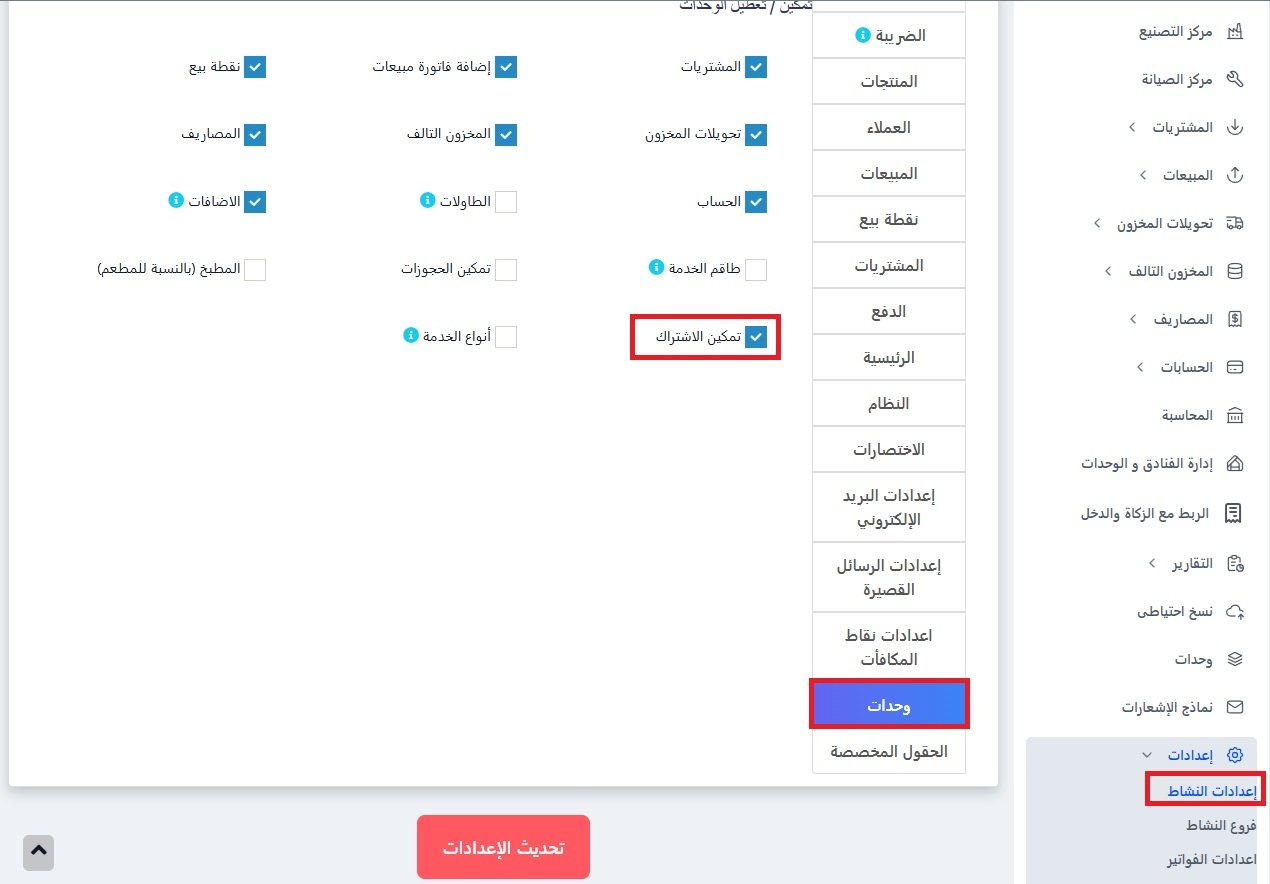 ثم قم بتمكين الاشتراك وتحديث الاعدادات